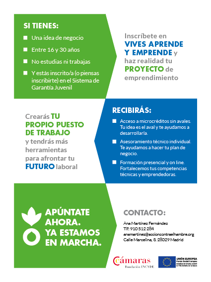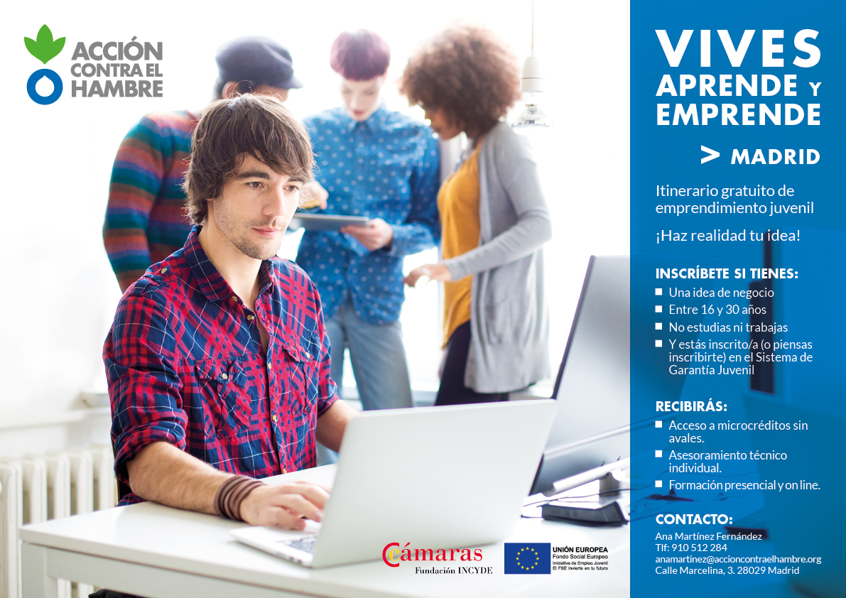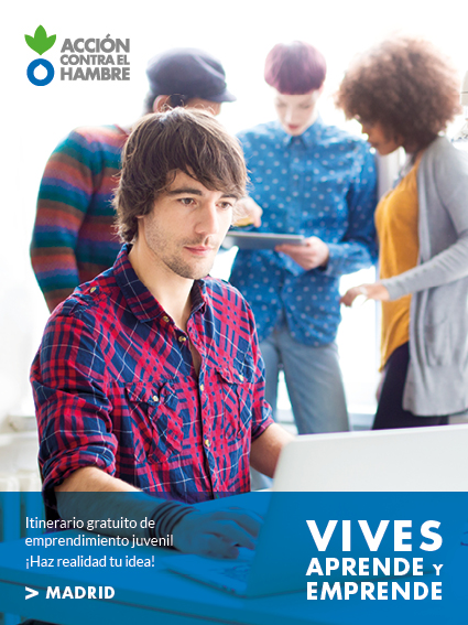 Folleto y cartel realizado para el programa Vives Aprende y Emprende de Acción contra el Hambre. Un programa destinado al desarrollo de proyectos de emprendimiento juvenil, para Madrid y Cataluña, por lo que se realizó bilingüe para esta última. Igualmente se realizaron plantillas autorellenables para contenidos internos en power point y adaptaciones para RRSS.