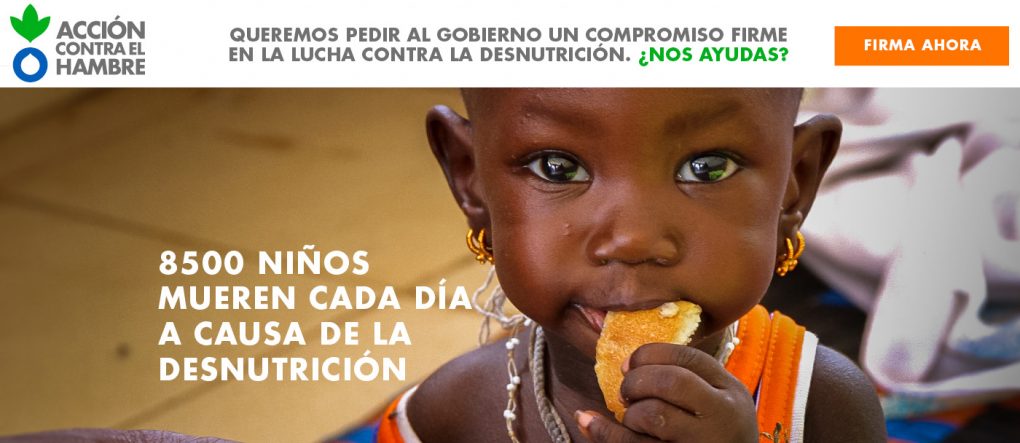 Diseño de landing page de captación firmas para Acción contra el Hambre, cuya finalidad es que el gobierno renueve su compromiso con la lucha contra la desnutrición.